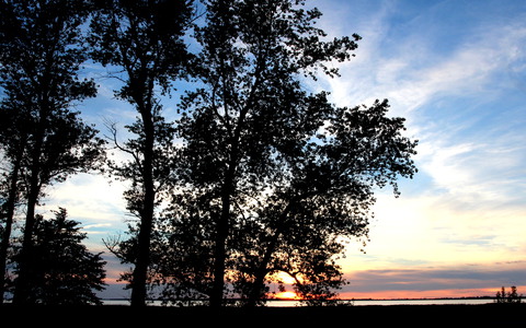 Hier sehen Sie , wie die Sonne im Bodden untergeht und diesen in wunderschönen Farben erstrahlen lässt.